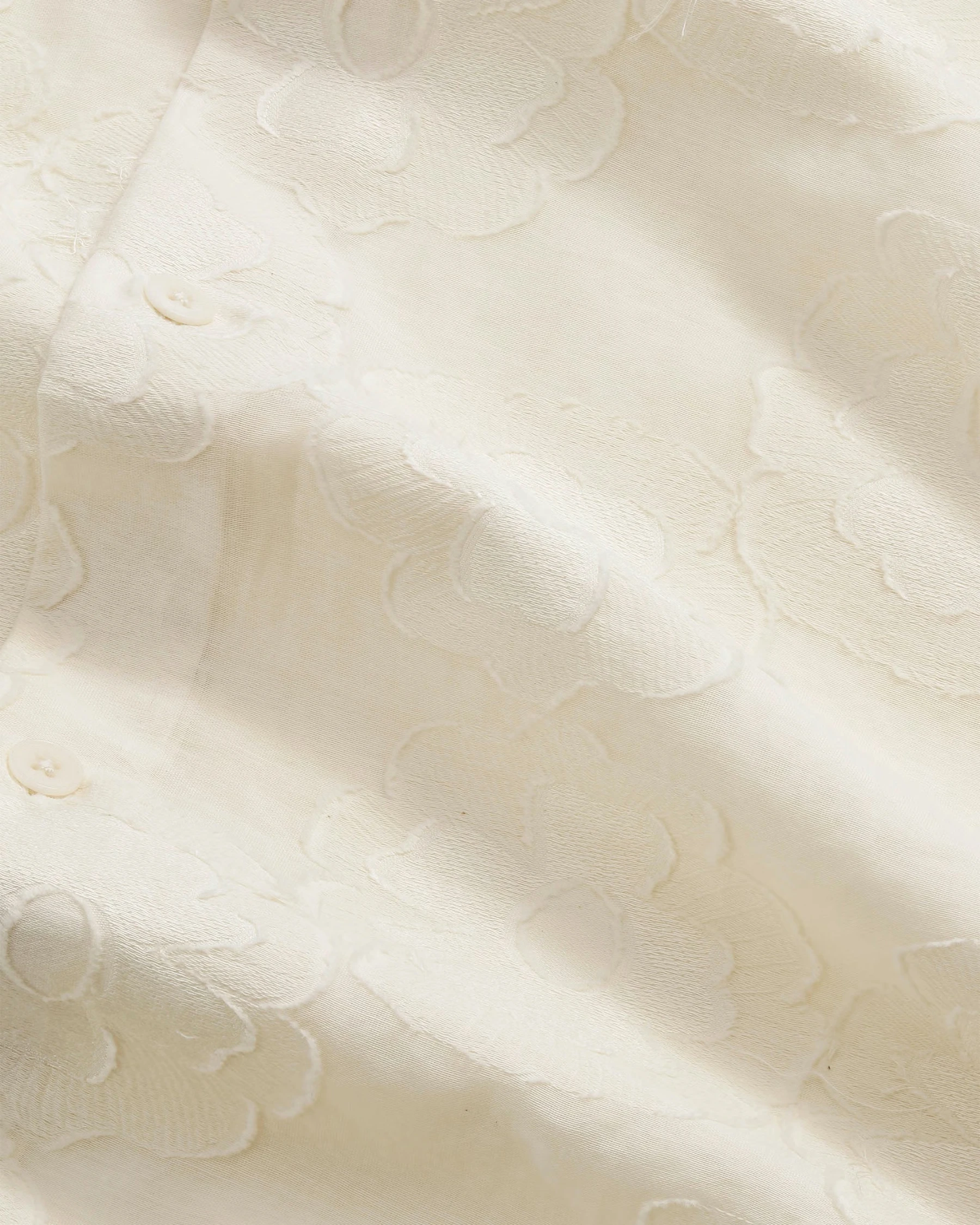 Le coton biologique assure douceur et respirabilité. La viscose ECOVERO™ apporte fluidité et légèreté, tandis que le polyester recyclé améliore la résistance du tissu.