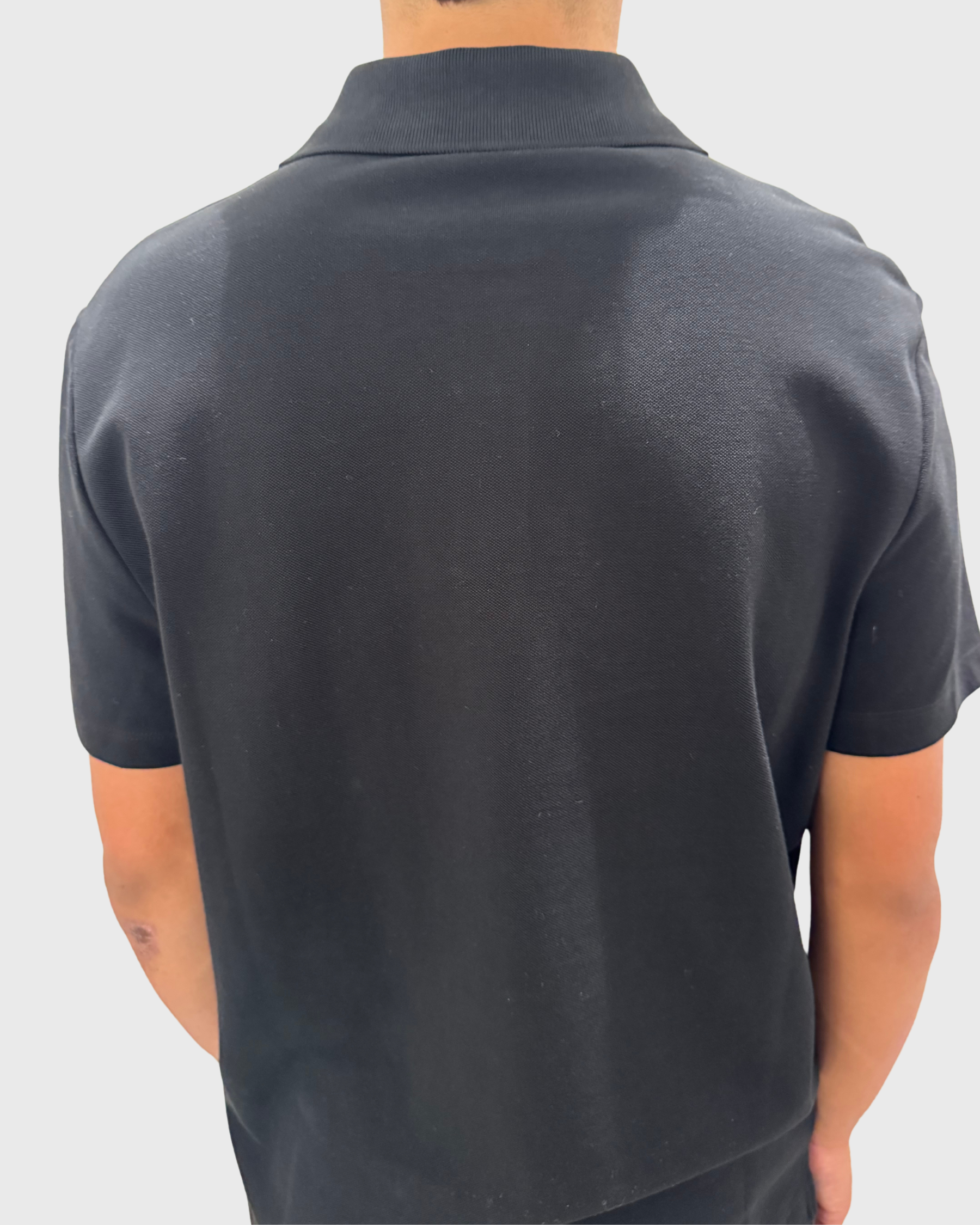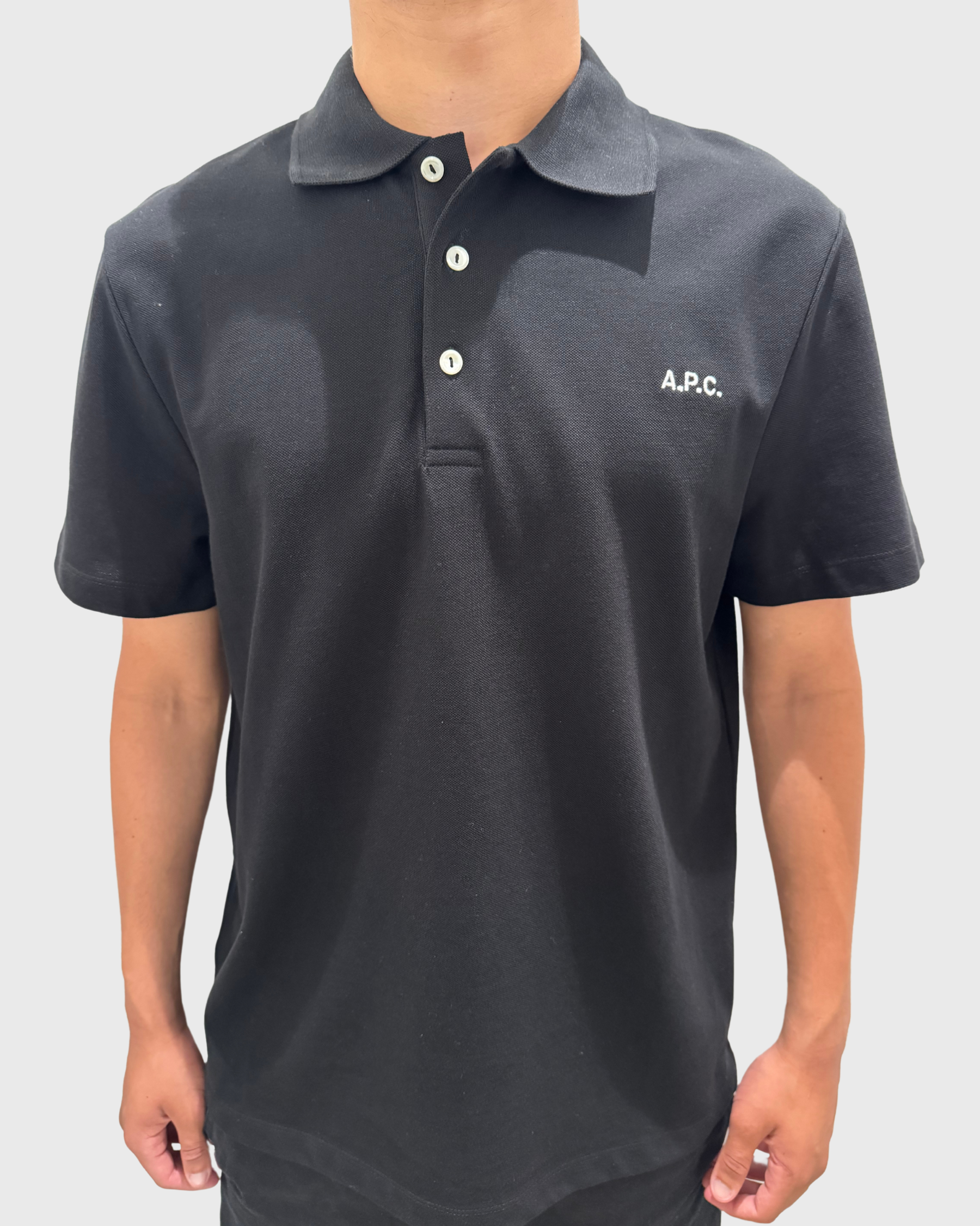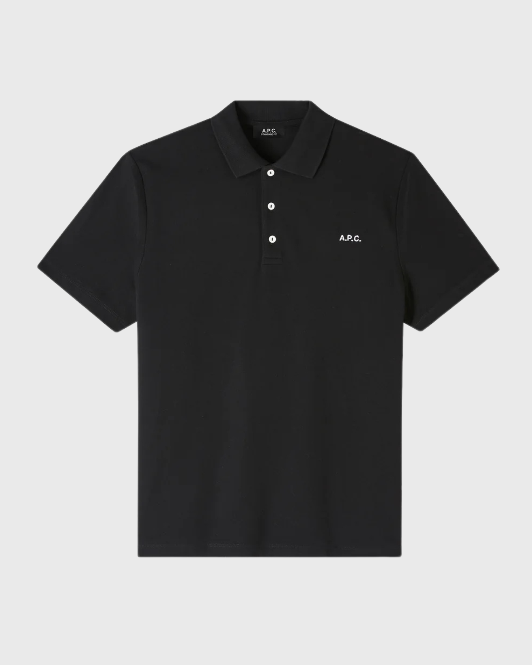 Le polo A.P.C noir reprend les codes de la maison parisienne avec justesse : une coupe droite, un col trois boutons, et une broderie blanche A.P.C. discrète sur le cœur. Il s’inscrit dans une approche épurée et intemporelle du style masculin.