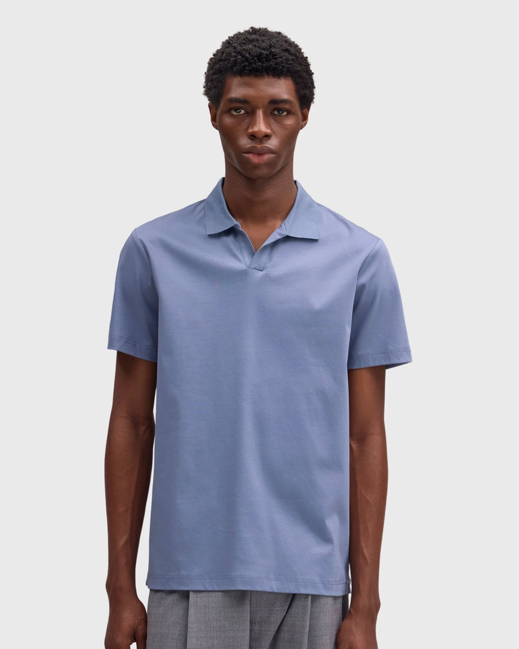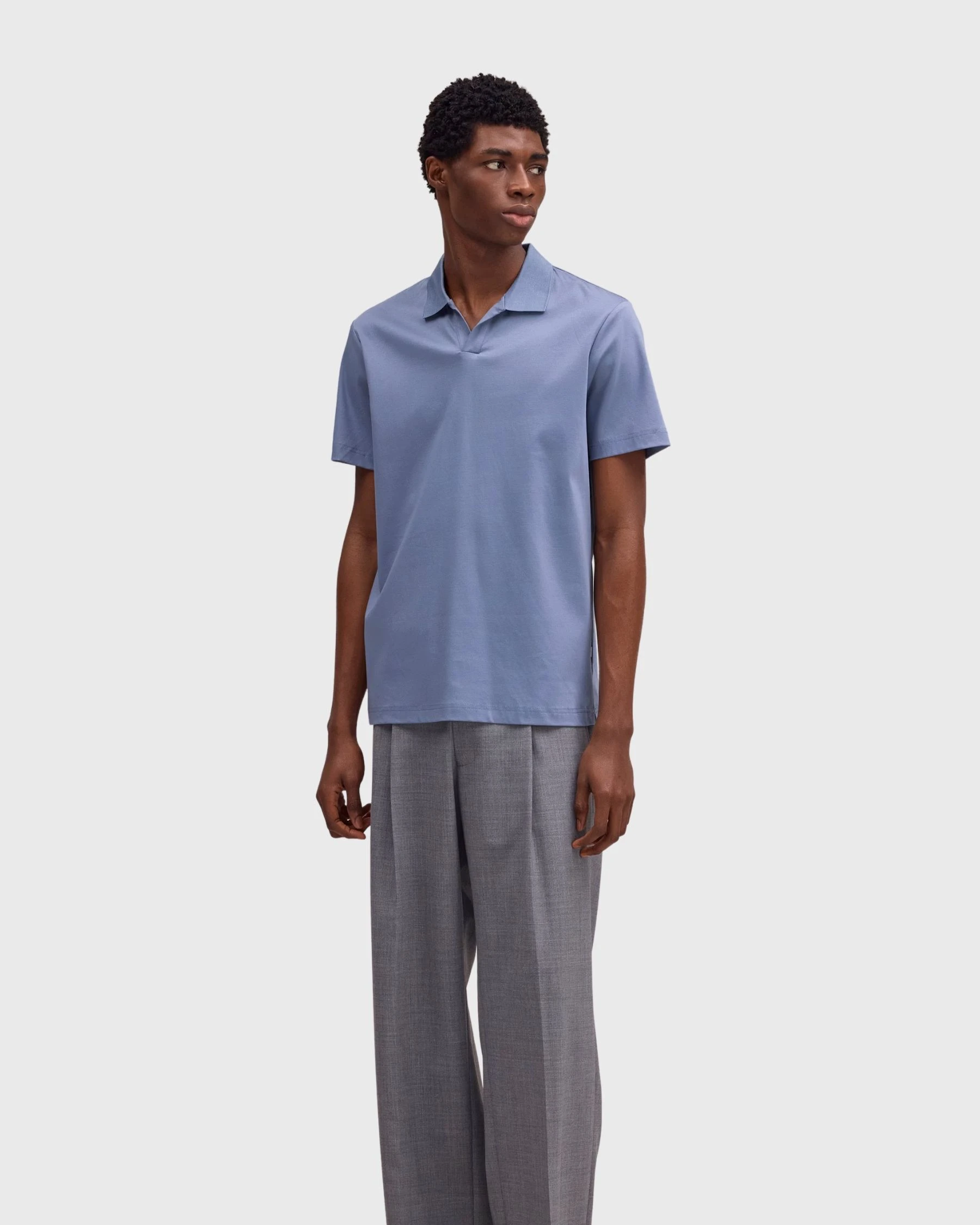 Son col ouvert apporte une allure moderne et différenciante. Sa matière en coton biologique assure confort et durabilité, sa coupe regular s’adapte à toutes les silhouettes et sa couleur Stone Blue facilite les associations.