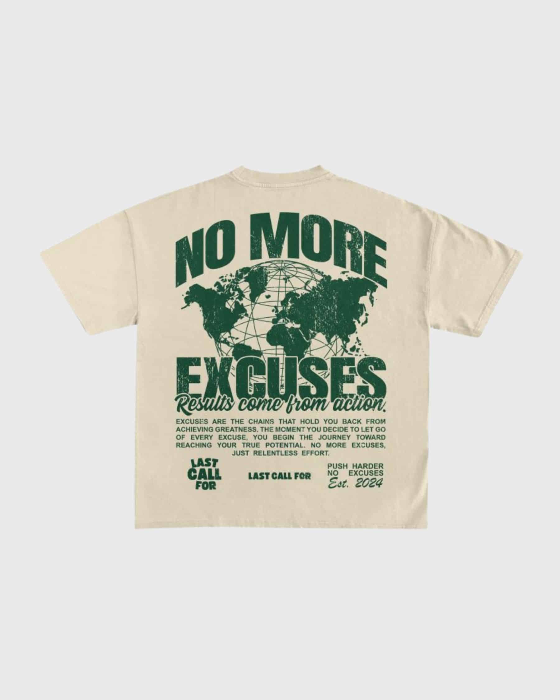 Le coloris beige apporte sobriété et élégance. Ainsi, le print graphique “NO EXCUSE” se détache avec justesse, sans excès. Ce contraste subtil permet de porter le t-shirt aussi bien seul qu’en superposition, selon la saison ou le style recherché.
