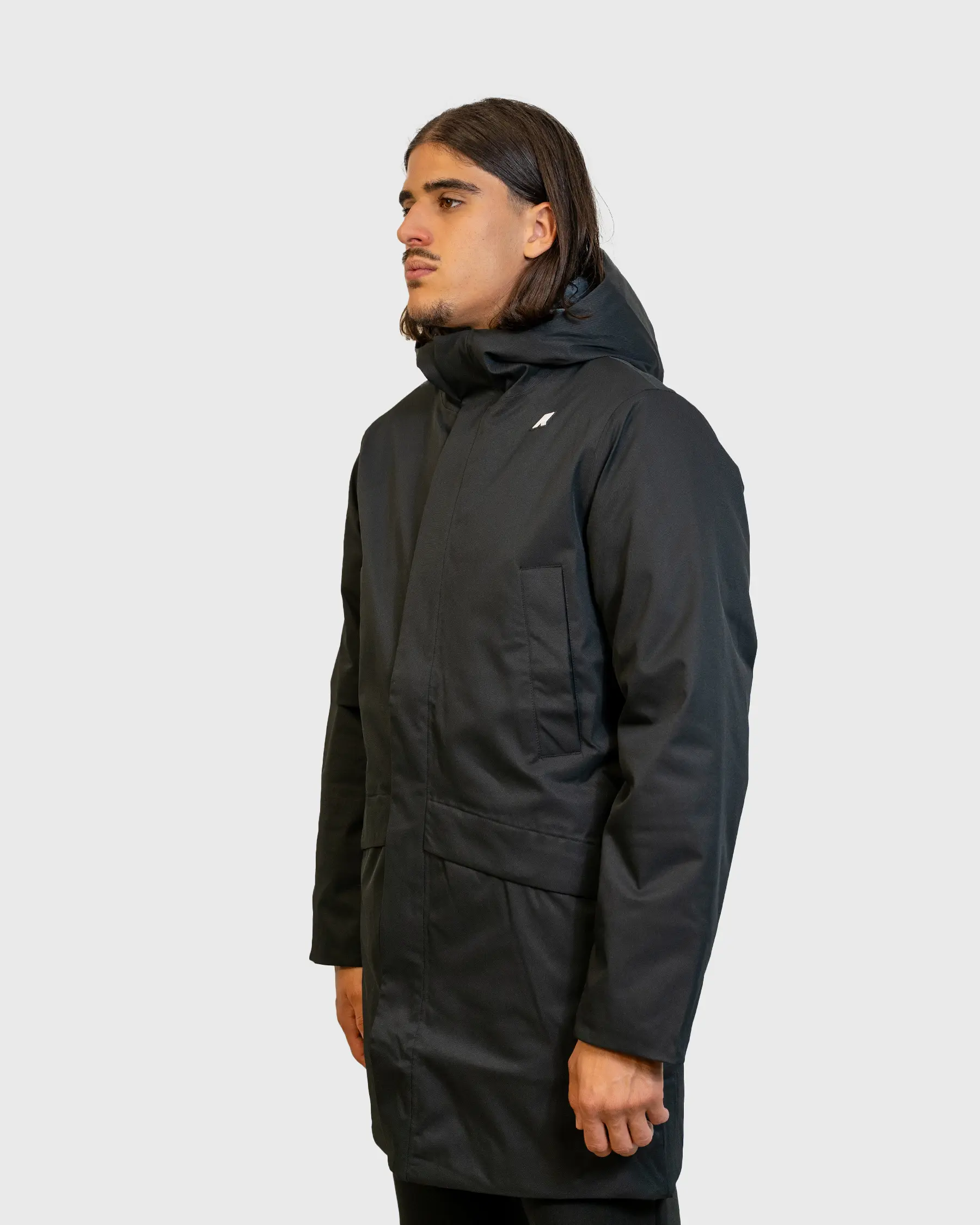 Une parka K-Way noire, fonctionnelle et intemporelle.