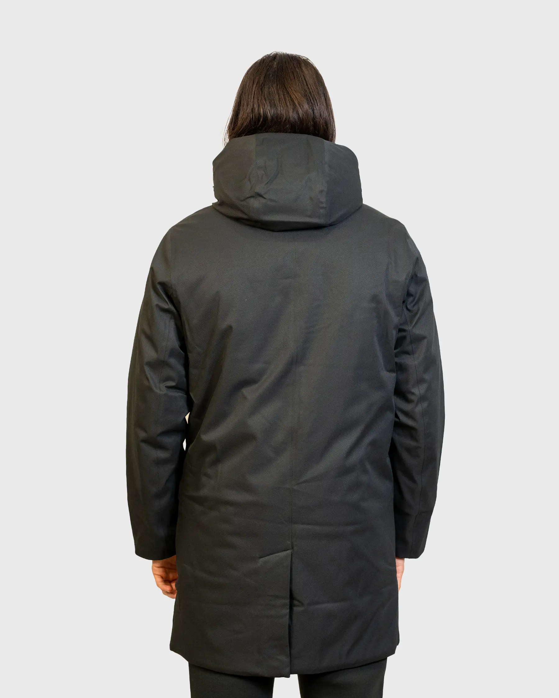 Une parka noire intemporelle, imperméable et pratique pour toutes les saisons.