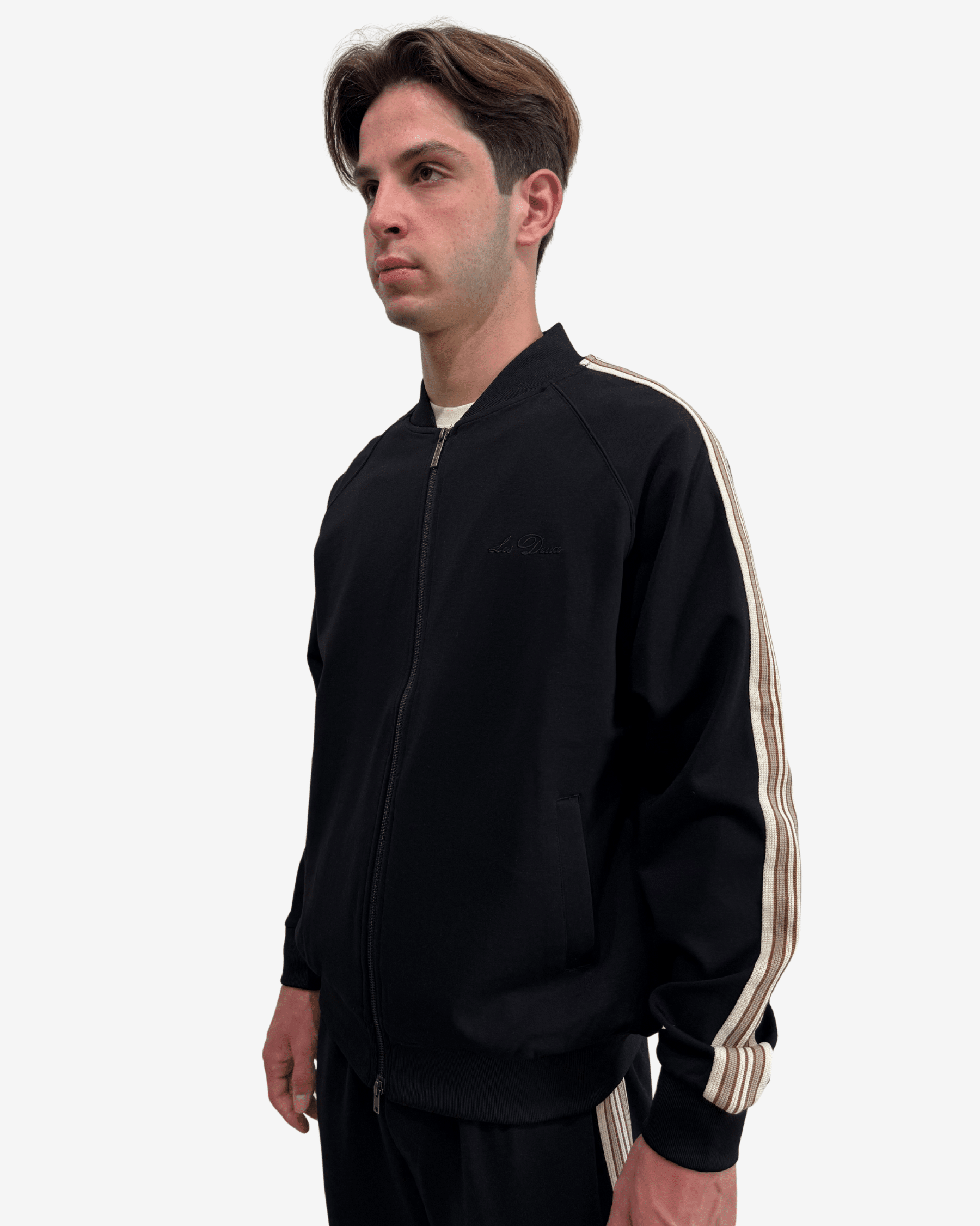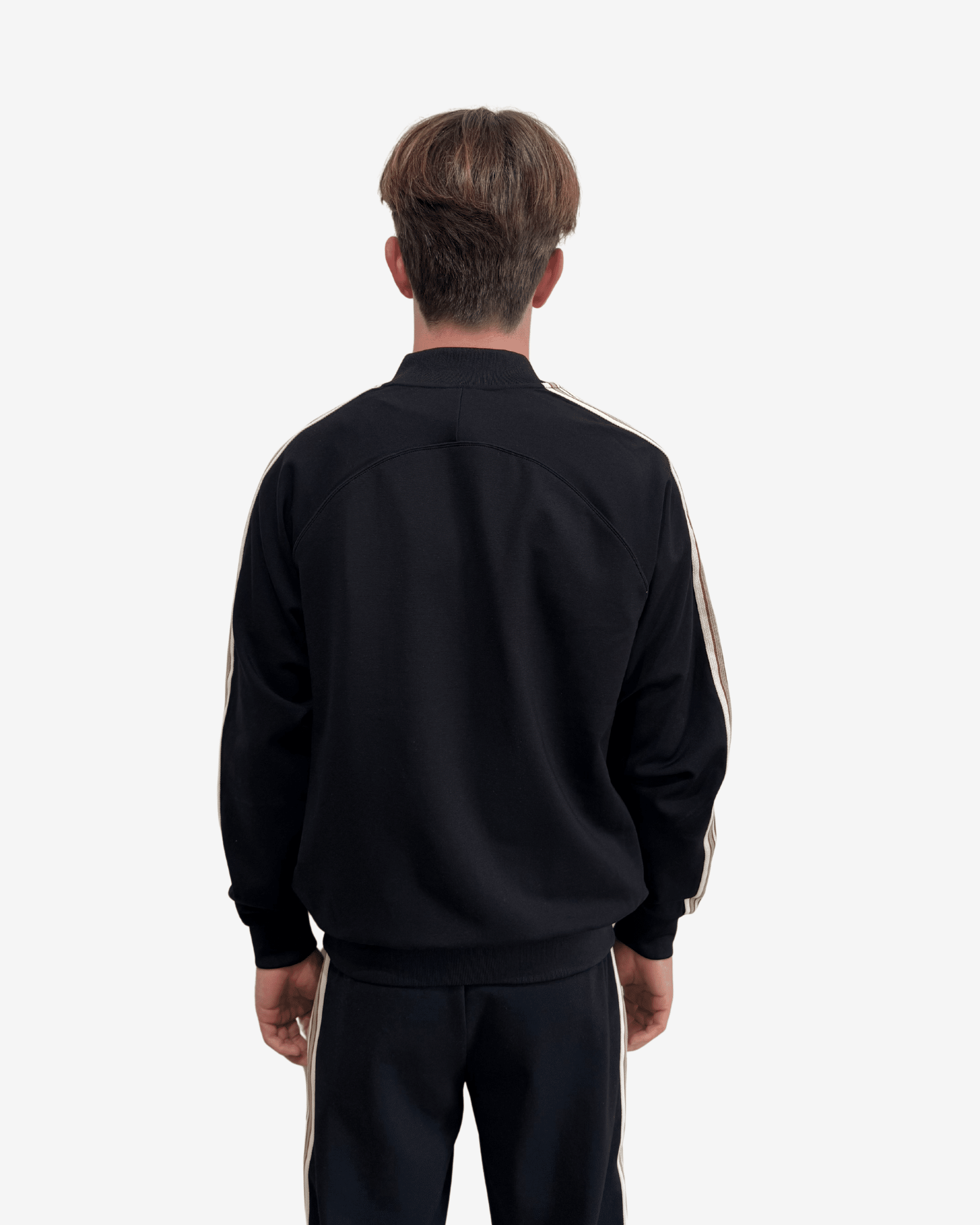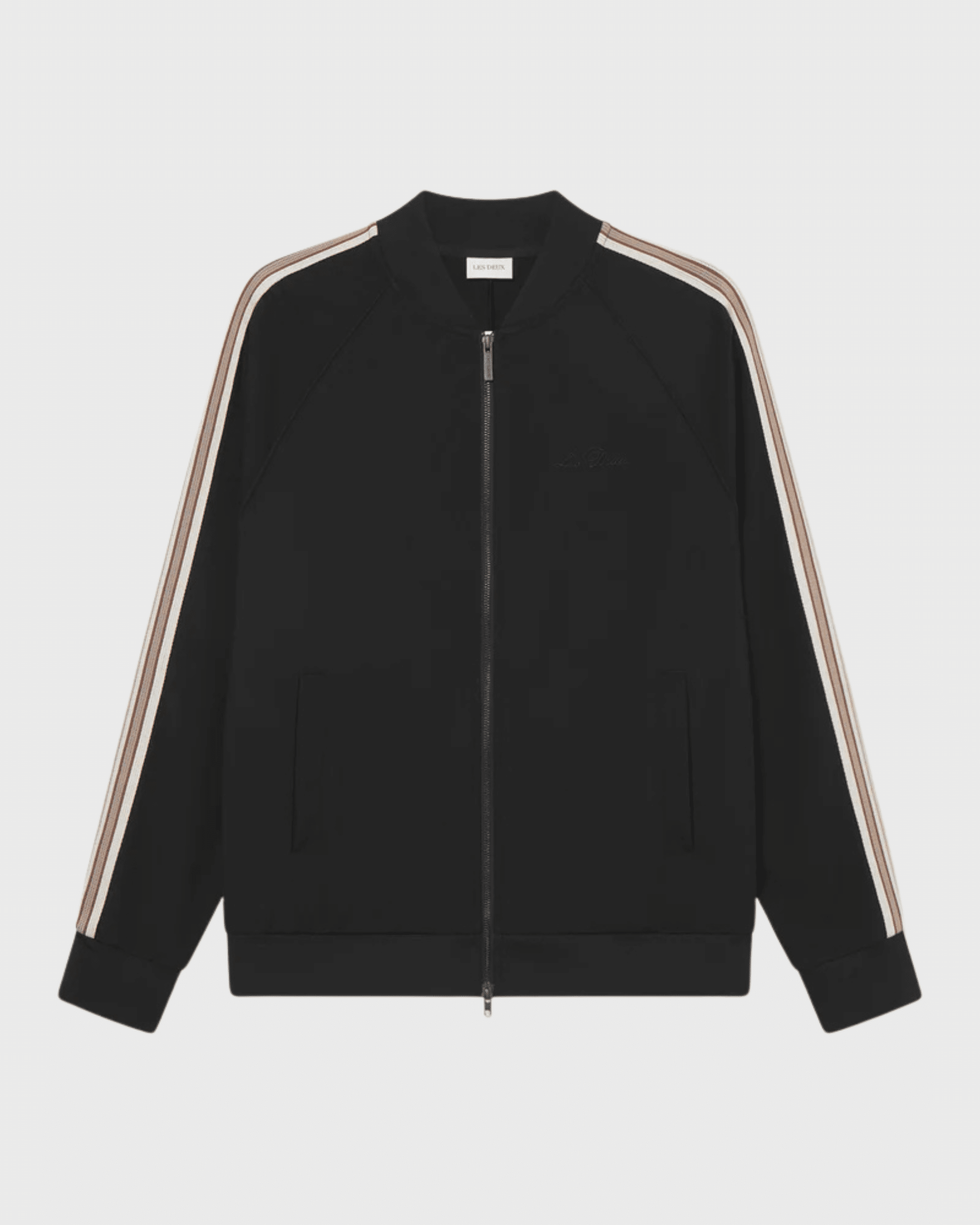 La veste Les Deux Sterling noire rend hommage aux vestes de survêtement classiques des années 80, tout en intégrant des codes contemporains. Sa matière technique légère assure un port confortable en toute saison, tandis que sa coupe raglan et ses bandes tricotées contrastées sur les bras soulignent son identité vintage assumée.