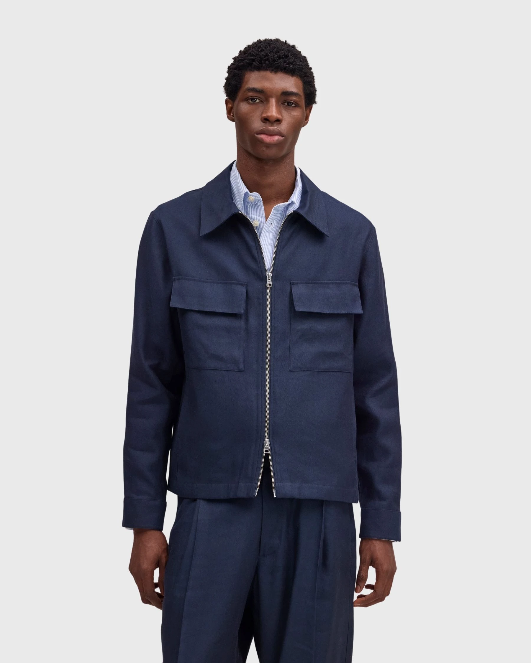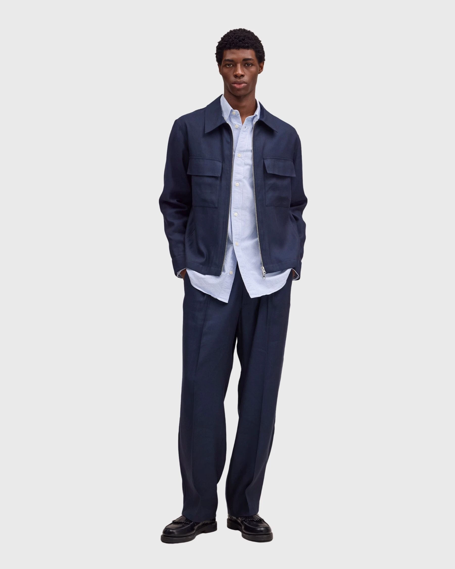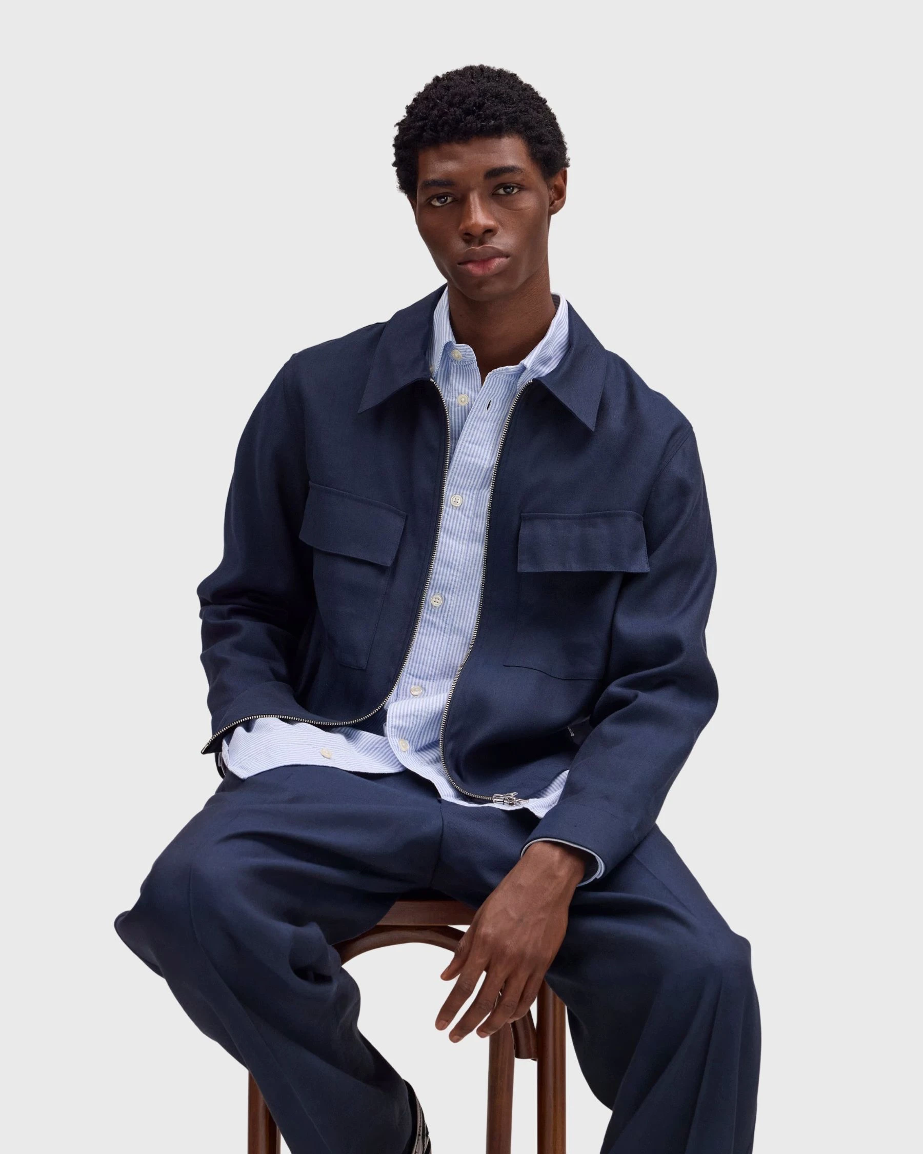 Sa couleur bleu profond s’accorde parfaitement avec des tons neutres comme l’écru, le gris ou le noir. Elle permet de créer des looks sobres, modernes et raffinés.