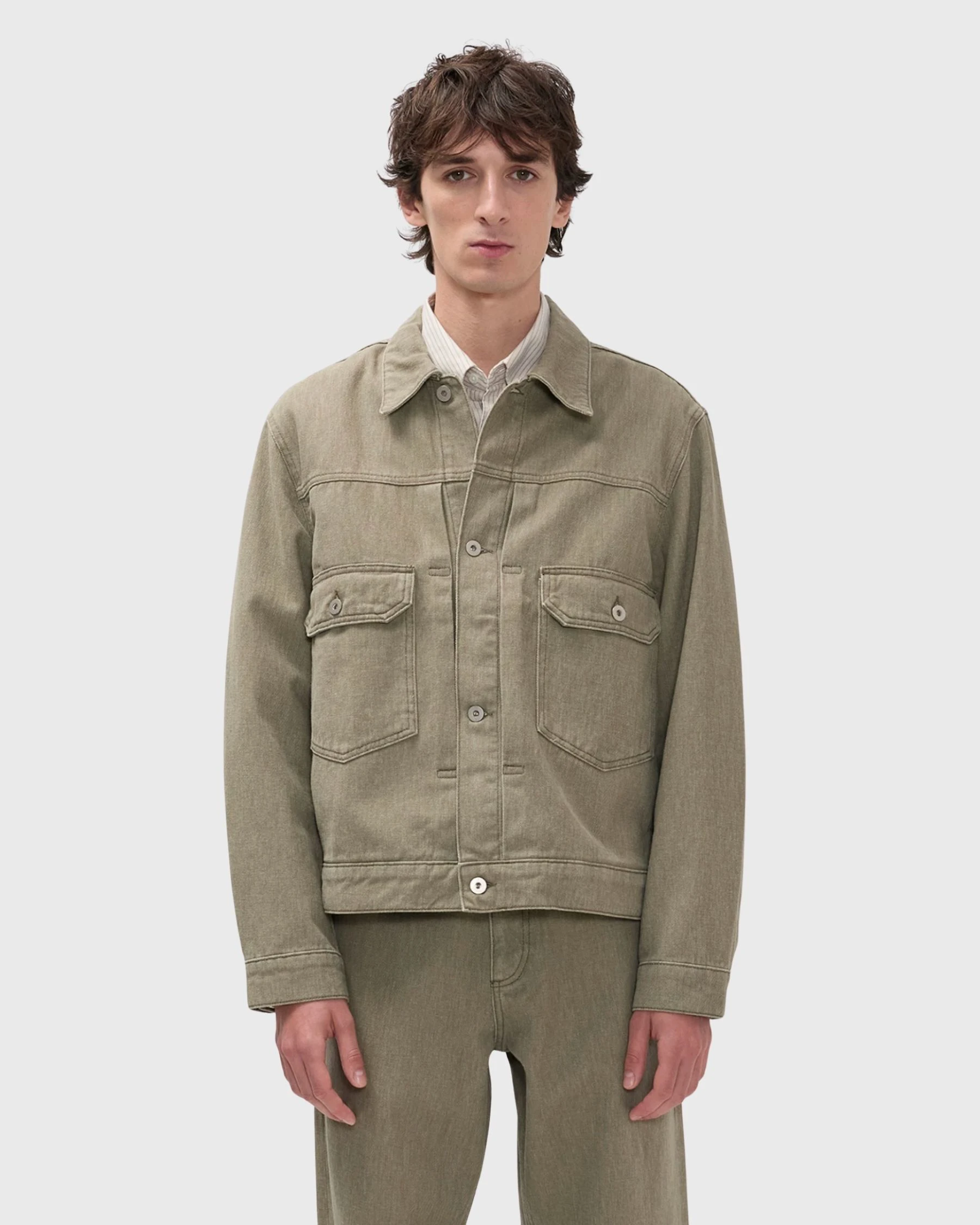 Sa coupe boxy apporte une silhouette moderne et structurée, tandis que son coloris profond “vetiver” renforce son caractère naturel et intemporel.